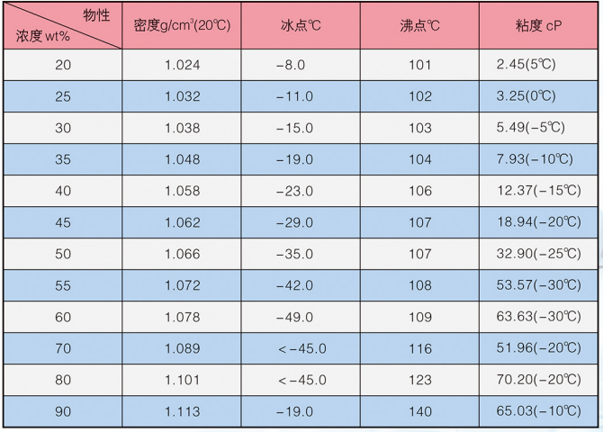 LM-4系列冰河冷媒由二元醇改性構成,主要添加劑包括防腐蝕劑,防霉劑,增溶劑,水穩劑等。外觀為淺色液體。安全低毒、無異味、不易燃、不易揮發。20℃時,原液密度為1.105~1.125g/cm',粘度為13.92mPa·s(cP),比熱為0.619cal/g℃,熱導率為0.26W/mK。沸點高于140℃,閃點高于120℃。