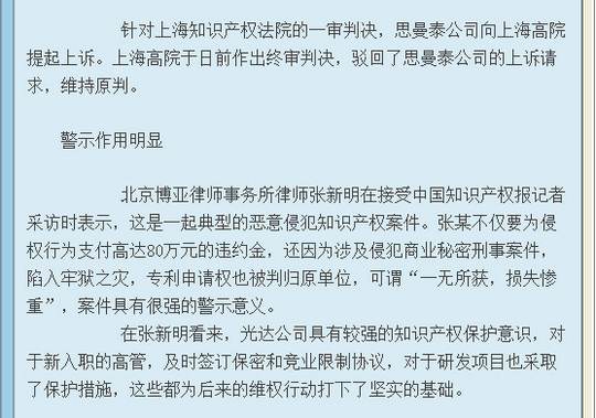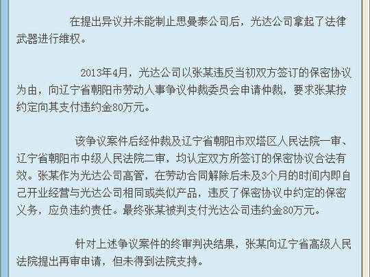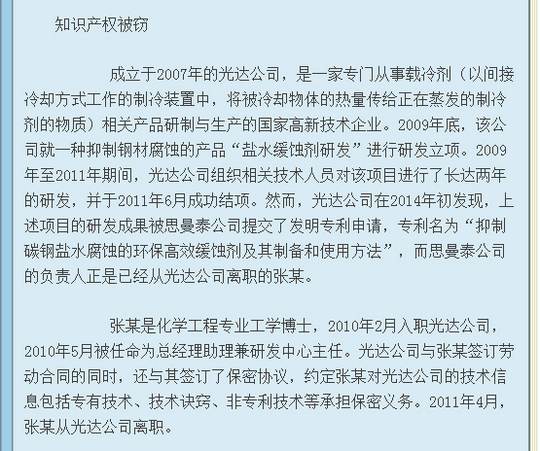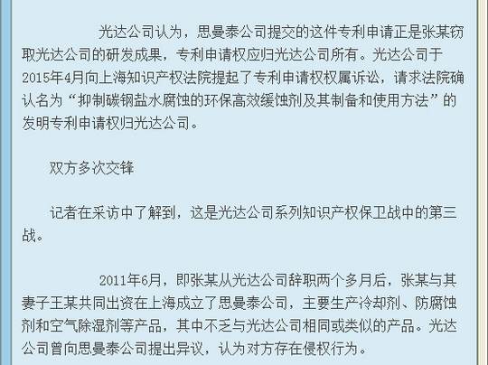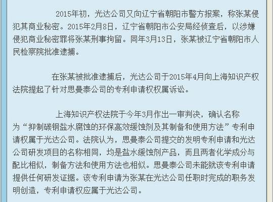 近日,上海市高級人民法院(下稱上海高院)對遼寧省朝陽光達化工有限公司(下稱光達公司)與上海思曼泰化工科技有限公司(下稱思曼泰公司)之間的專利申請權權屬糾紛案作出終審判決,維持此前一審法院作出的涉案專利申請權屬于光達公司的判決結果。在與這件專利申請相關的其他案件中,原為光達公司高管后為思曼泰公司原法定代表人的張某,不僅因為違反競業限制合同被法院判令其賠償光達公司違約金80萬元,還因涉嫌侵犯商業秘密罪被依法逮捕。光達公司不認可法院判決,又在遼寧省朝陽市雙塔區人民法院進行上訴,在2017年8月30日開庭,判決結果如下: