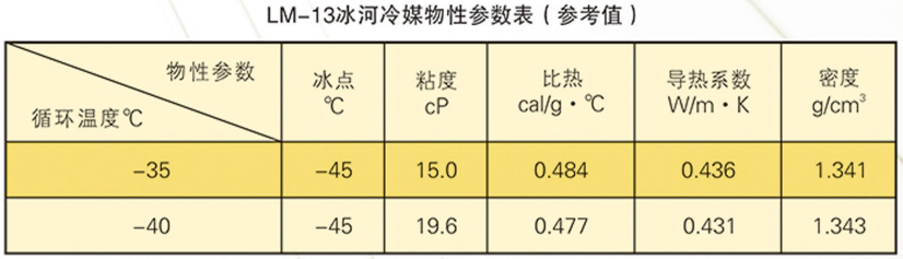 本品適用于低溫庫和速凍庫做間接制冷載冷劑使用。使用時先將系統清洗干凈,然后將本品直接加入系統使用,具體物性參數參考下表。