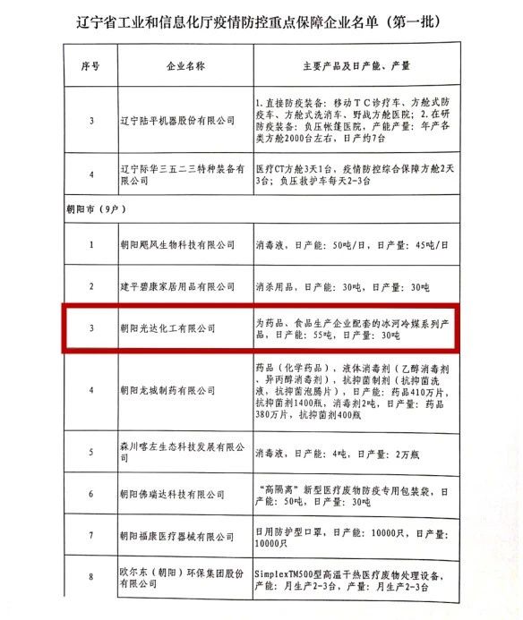 冰河冷媒被列入“遼寧省疫情防控重點保障企業”名單