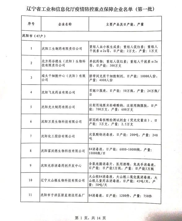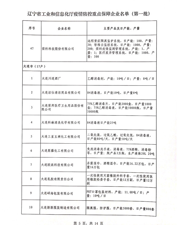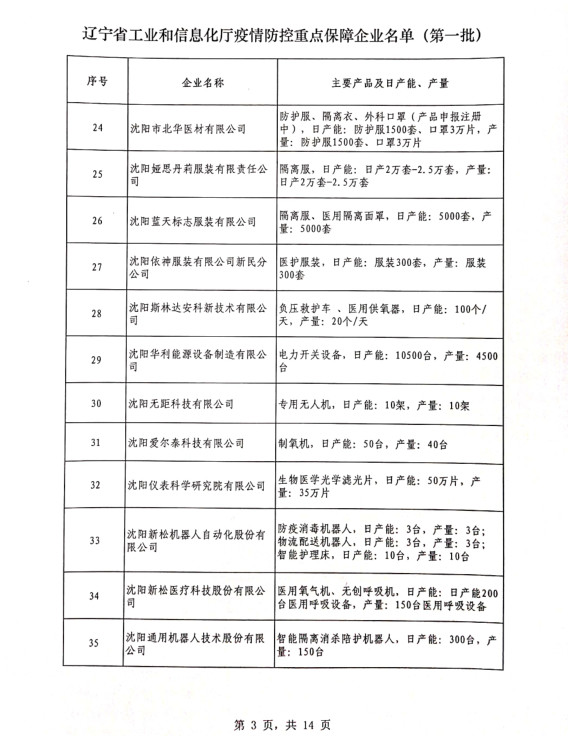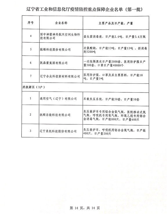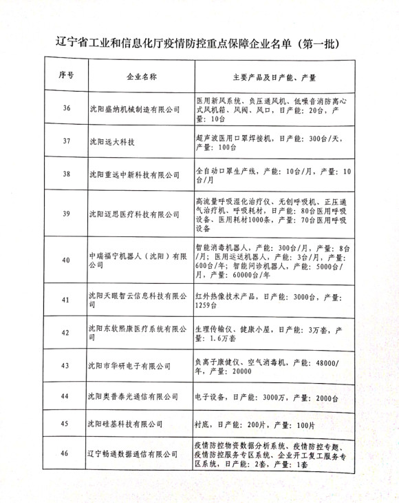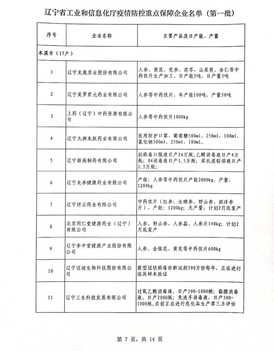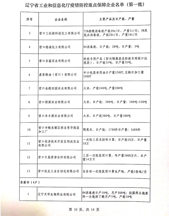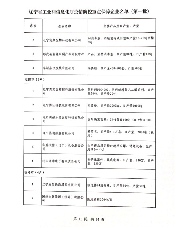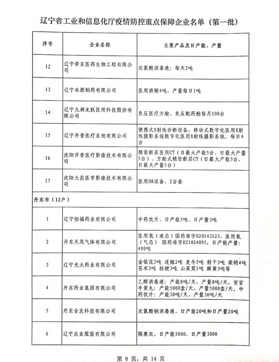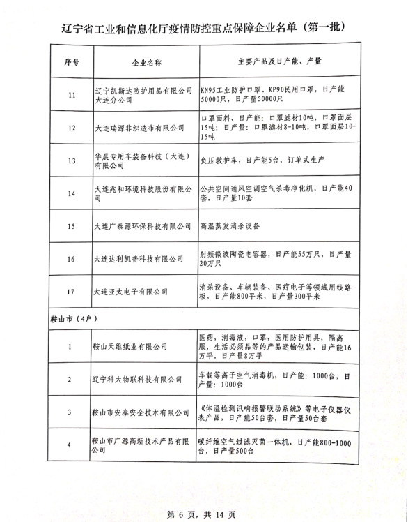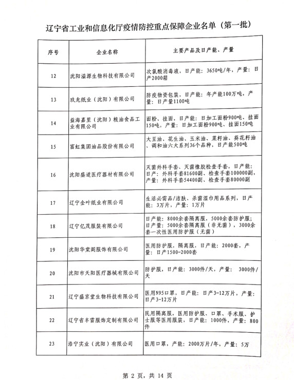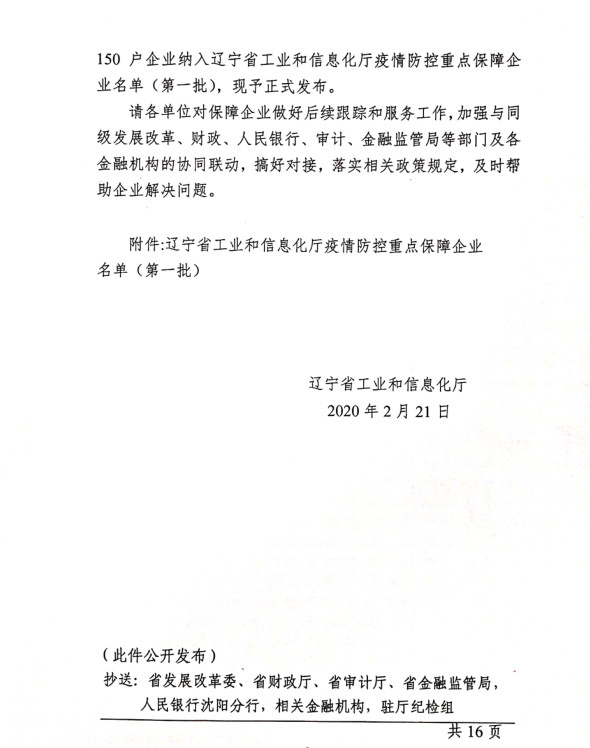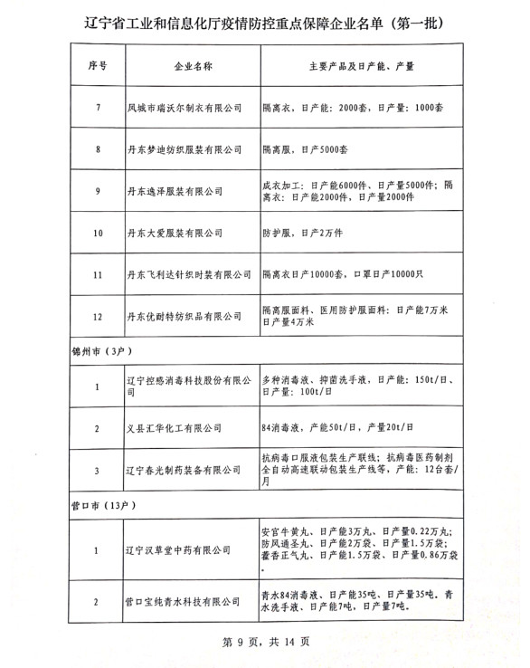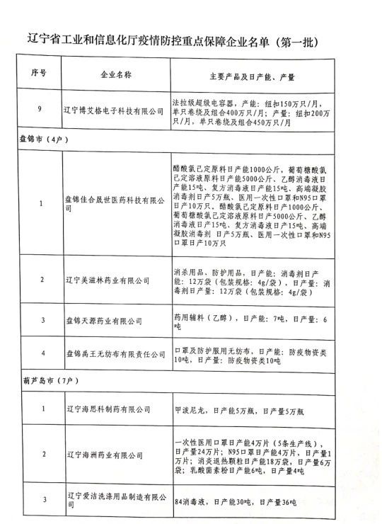 為貫徹落實習近平總書記關于疫情防控工作的重要講話和指示批示精神,落實黨中央、國務院和省委、省政府有關部署,按照《遼寧省人民政府關于印發遼寧省應對新型冠狀病毒感染的肺炎疫情支持中小企業生產經營若干政策措施的通知》(遼政發【2020】6號)和《遼寧省工業和信息化廳關于規范省級疫情防控重點保障企業名單管理有關事項的通知》(遼工信明電【2020】35號)要求,在各市審核推薦的基礎上,經我廳認真研究,決定以下150戶企業納入遼寧省工業和信息化廳疫情防控重點保障企業名單(第一批)。